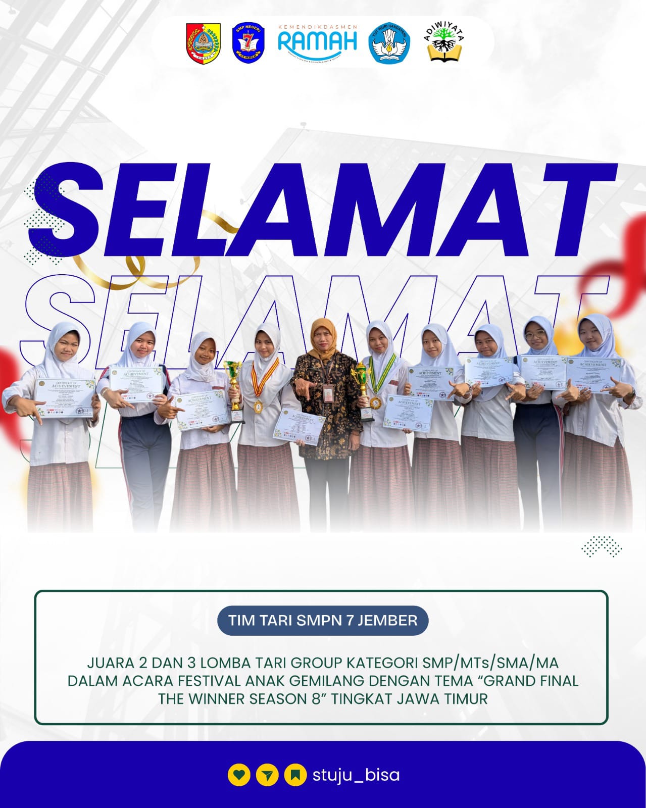 Jember,radarsidoarjo.site – Prestasi kembali ditorehkan oleh SMP Negeri 7 Jember. Tim Tari SMPN 7 Jember berhasil meraih Juara 2 dan Juara 3 pada ajang Lomba Tari Grup kategori SMP/MTs/SMA/MA dalam Festival Anak Gemilang bertema “Grand Final The Winner Season 8” tingkat *Provinsi Jawa Timur.