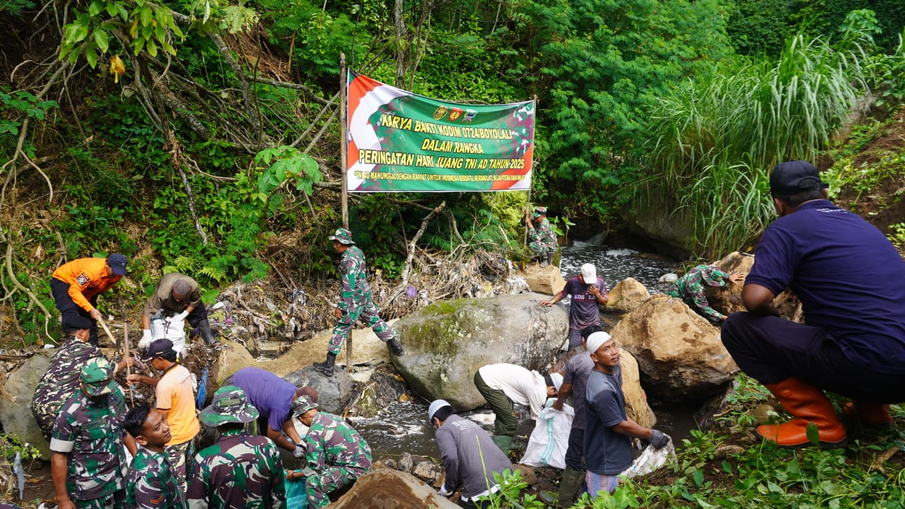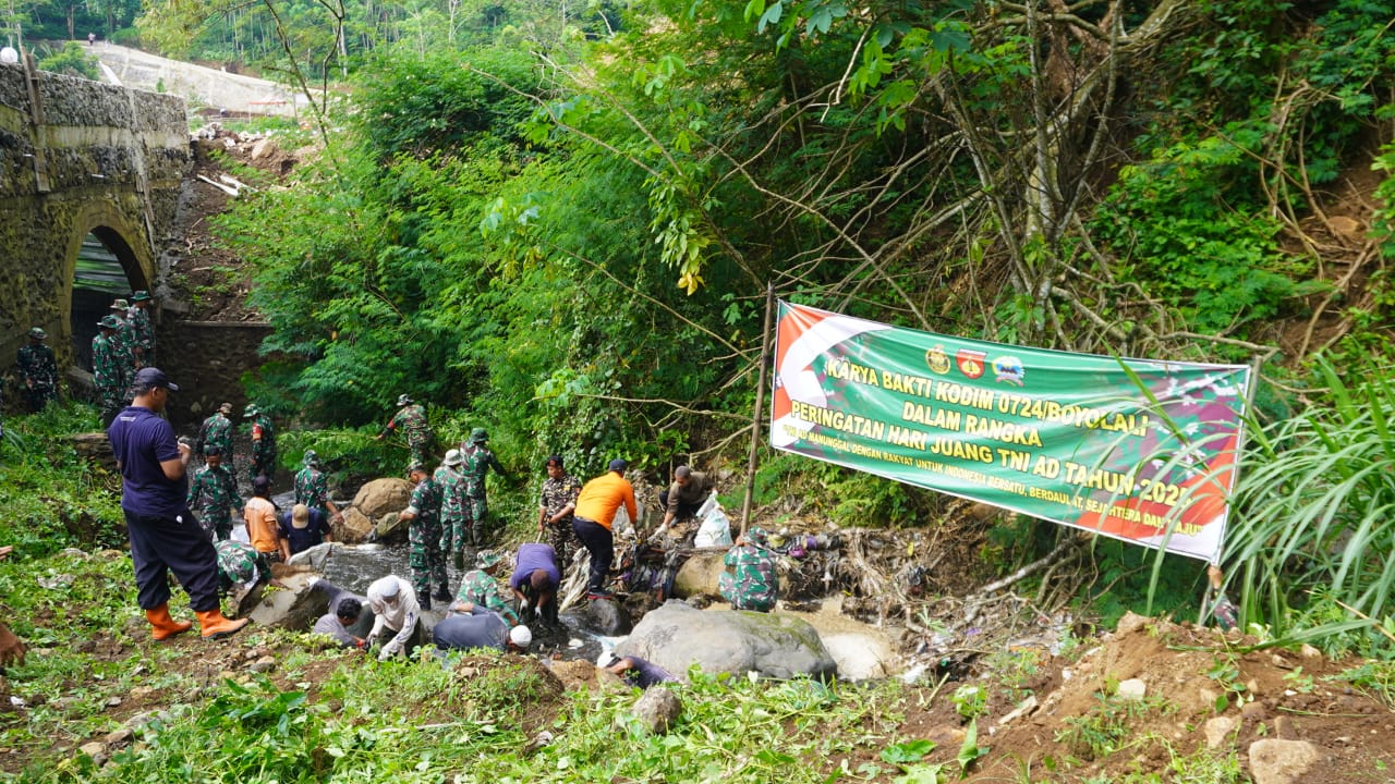 Dalam rangka memperingati Hari Juang TNI AD ke-80, jajaran Kodim melaksanakan karya bakti pembersihan aliran sungai di Desa Candi, Kecamatan Ampel, Kabupaten Boyolali, pada Jumat (12/12/25).