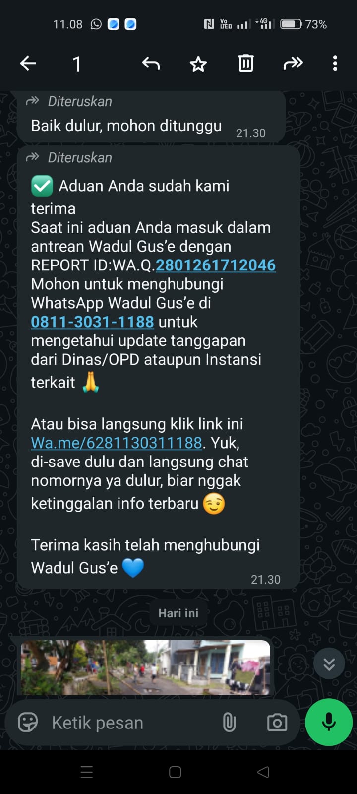 Dalam sistem Wadul Gus’e tercatat bahwa laporan sempat menunggu disposisi dinas terkait, kemudian didisposisikan dan saat ini telah mendapatkan respons dengan keterangan, “Aduan kami terima, segera kami tindaklanjuti.”